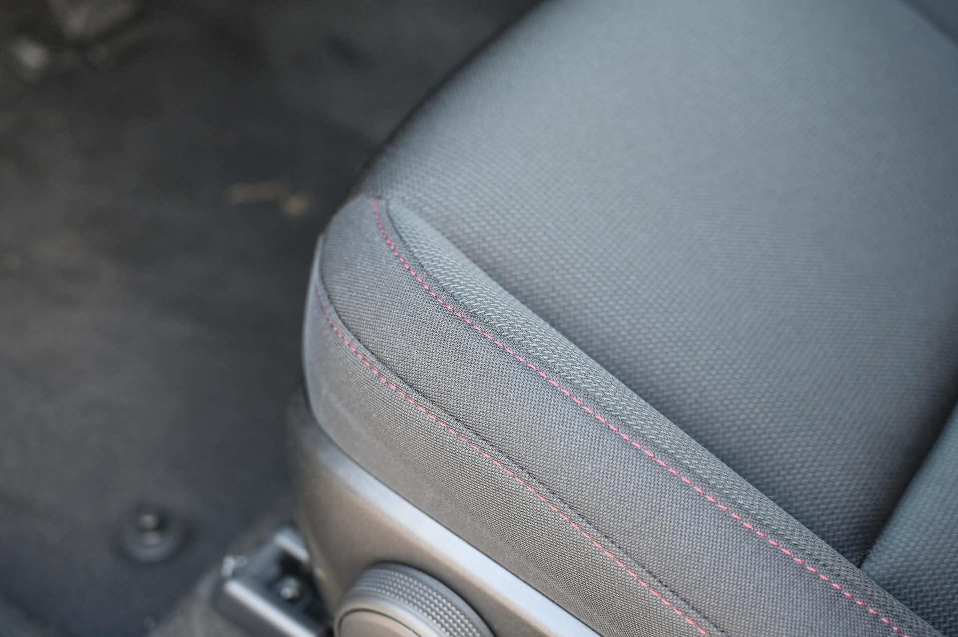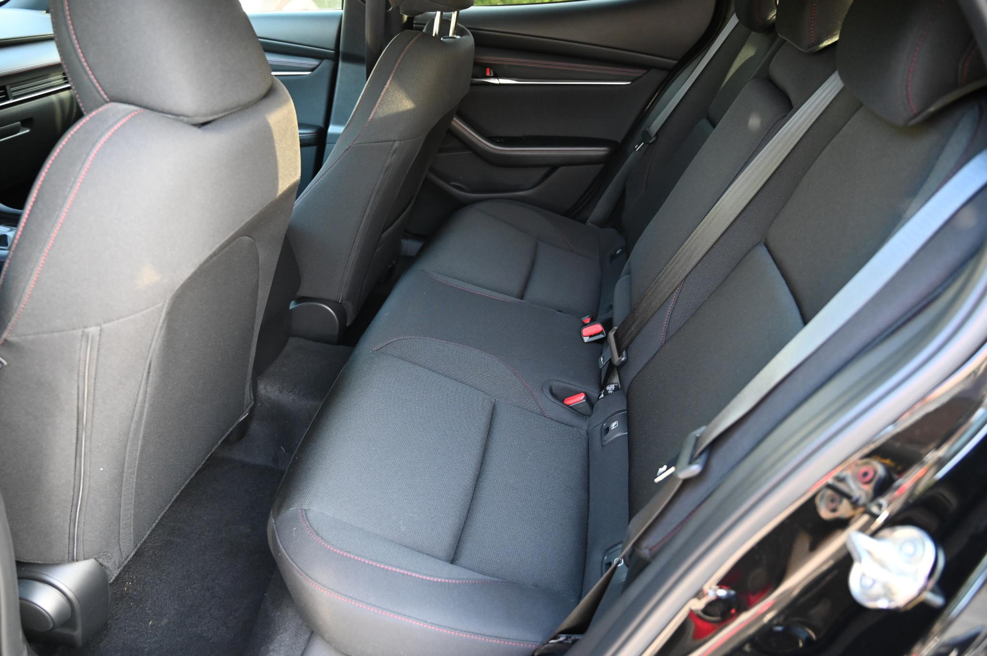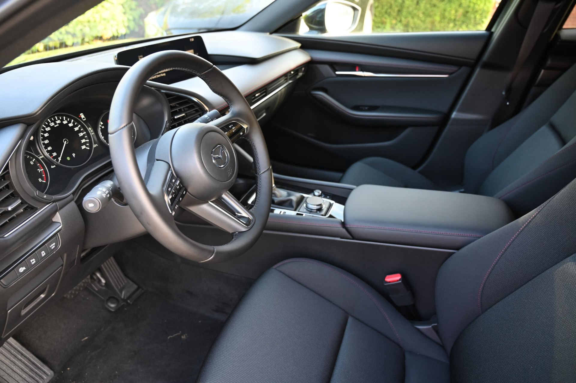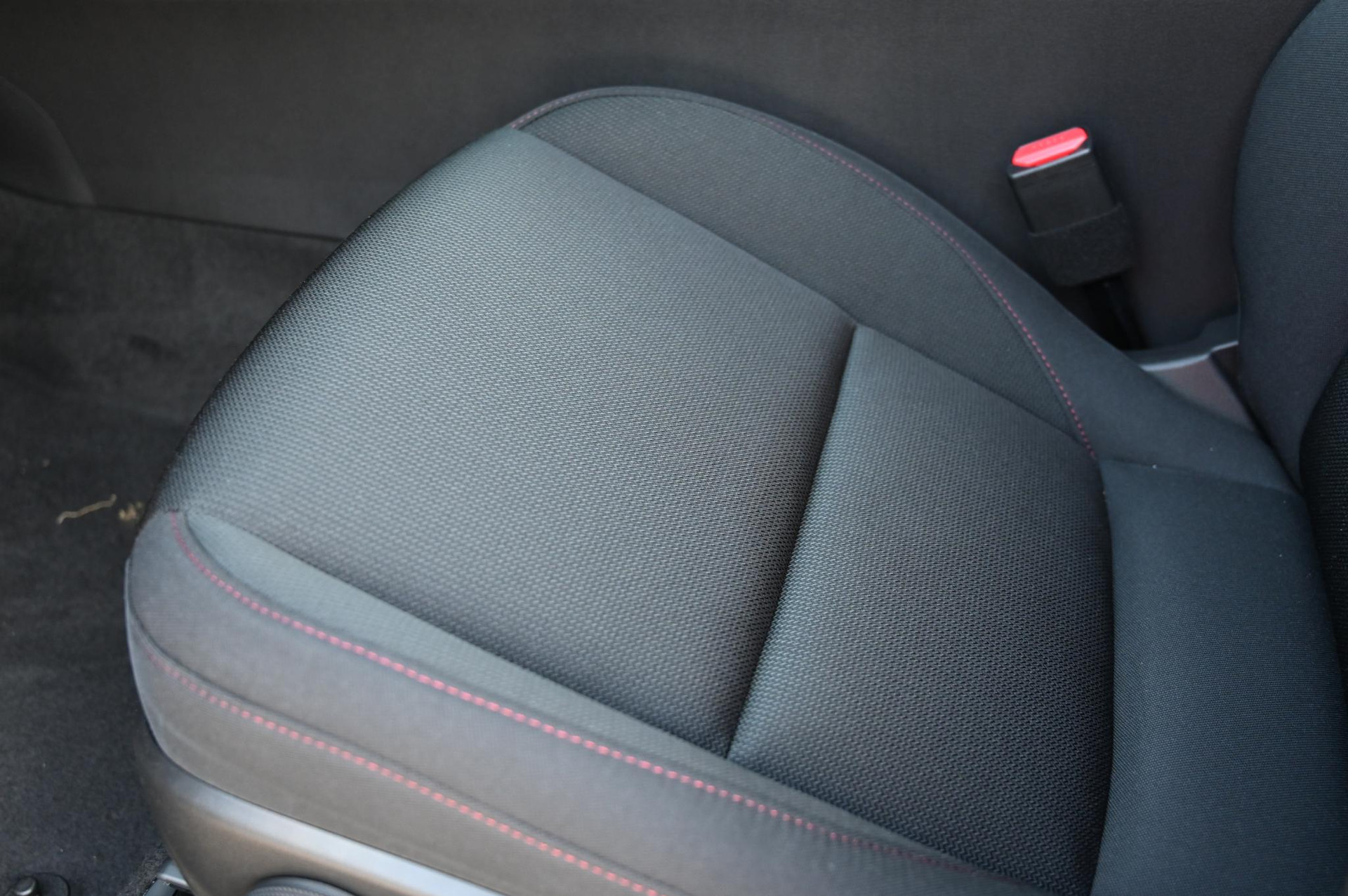 - Zwart stoffen interieur met rood stiksel