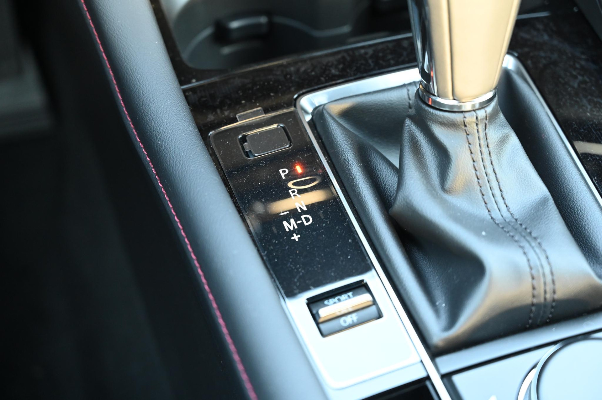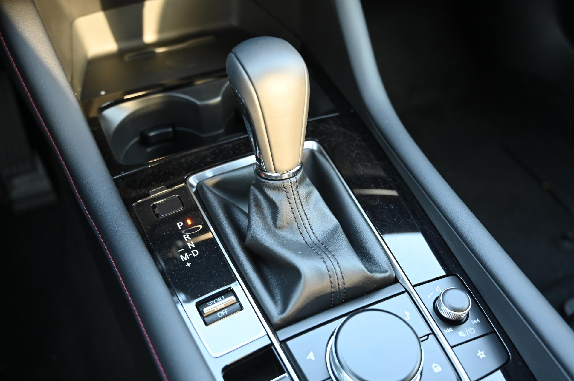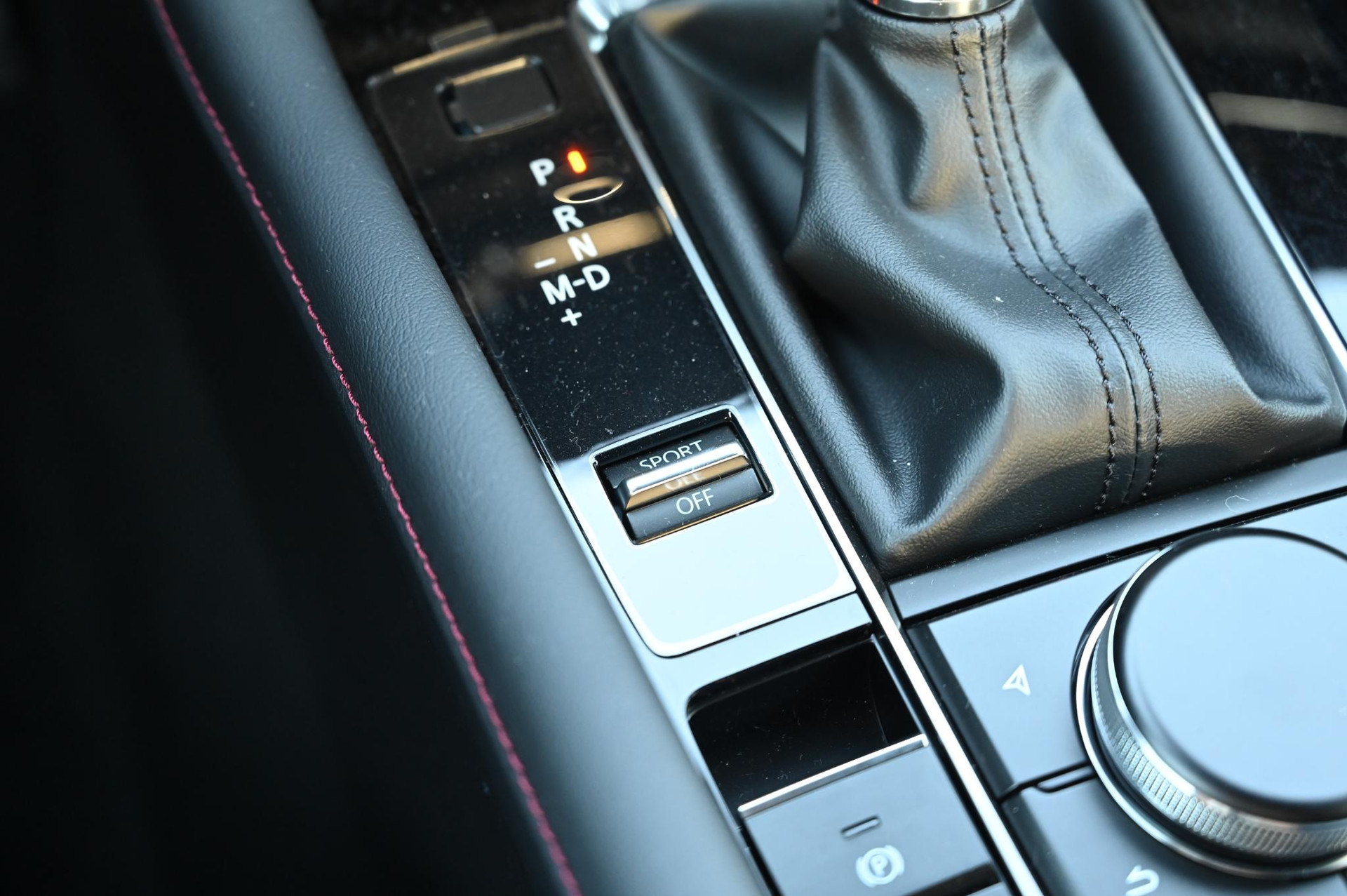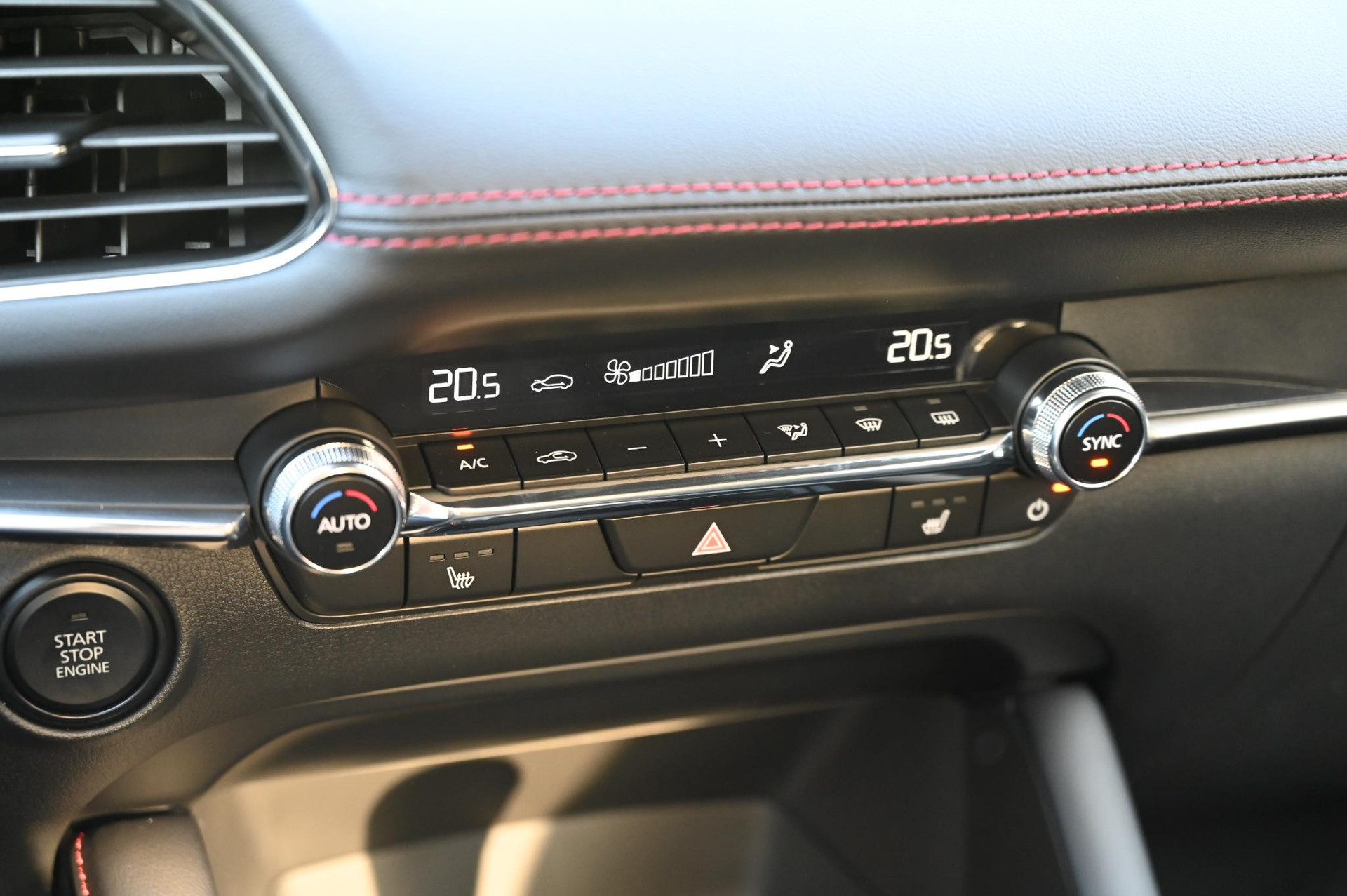 - Zwart stoffen interieur met rood stiksel