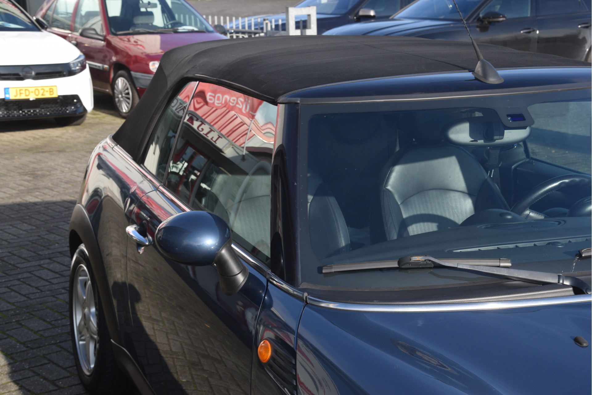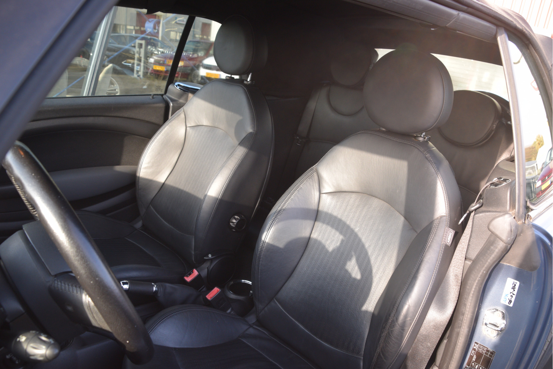 Leuke Mini cabriolet. O.a. voorzien van lederen bekleding, stoelverwarming, parkeersensoren, airco, licht metalen wielen en radio/CD speler.