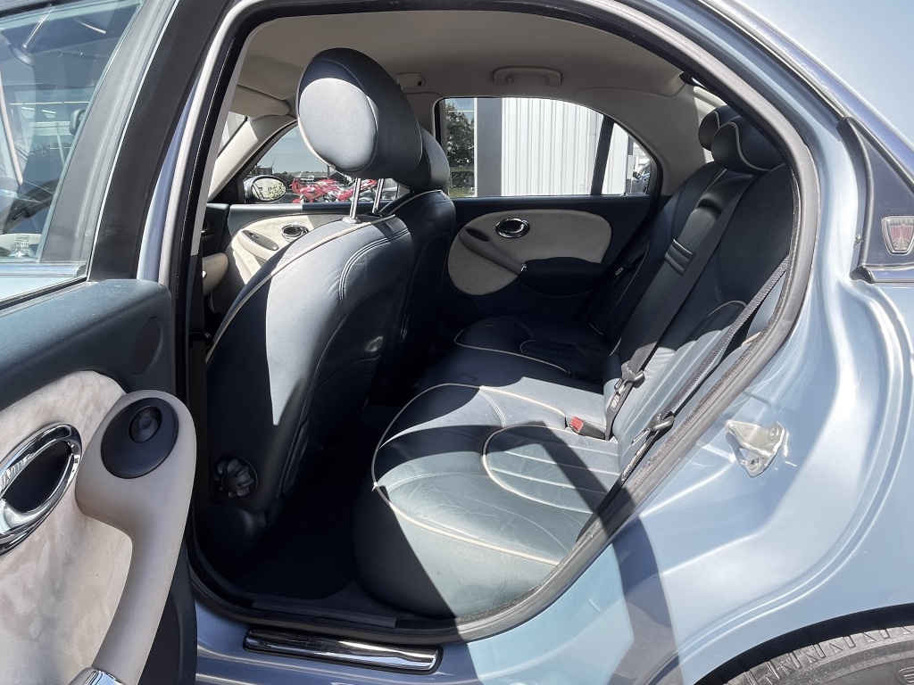 Deze origineel Nederlandse Rover 75 in Wedgwood Blue met personal line blauw leder interieur is een van de introductie auto’s dwz met de meest volledige optielijst. Deze eerste productieversie stamt uit de tijd dat er nog geld was bij het Rover concern en dat zie je aan allerlei prachtige details die de latere bouwjaren moesten missen. Zoals de chromen typeschildjes onderaan de voorportieren, de mooie 3-d logootjes gemonteerd op de schildjes in de achterportieren, de Rover merknaam in het verchroomde armatuur van de kentekenverlichting, het dashboard uit echt wortelnotenhout ipv het latere kunststof en meer van dat soort schitterende details.