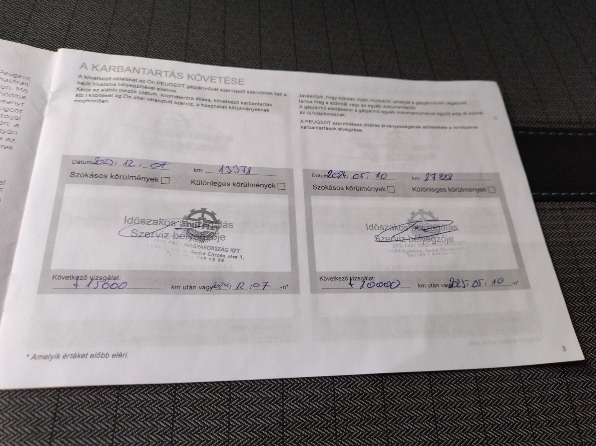 De onderhoudsboekjes zijn aanwezig en gestempeld, en ook de onderhoudsfacturen van de Peugeot-dealer zijn aanwezig. De onderhoudshistorie ziet er als volgt uit. Er is onderhoud uitgevoerd bij 13.349 km op 12-12-2023 (o.a. motorolie, oliefilter en interieurfilter vernieuwd), bij 27.888 km op 10-5-2024 (o.a. motorolie, oliefilter, bougies, interieurfilter en luchtfilter vernieuwd), bij 41.998 km op 8-10-2024 (motorolie, oliefilter en interieurfilter vernieuwd), en bij 49.636 km op 10-10-2025 (o.a. motorolie, oliefilter, interieurfilter, luchtfilter, remvloeistof en bougies vernieuwd).