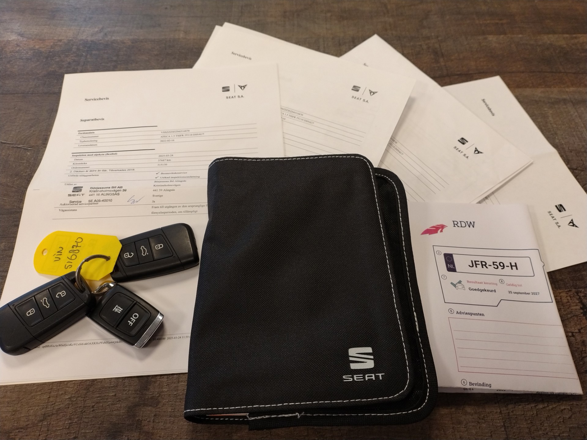 De onderhoudshistorie staat netjes digitaal geregistreerd in het serviceregister van Seat. Deze Seat is onderhoud door de Seat-dealer in Alingsas (Zweden). Bij 17.998 km op 15-11-2023 zijn motorolie en oliefilter vernieuwd. Bij 22.264 km op 4-4-2024 is een inspectie uitgevoerd en is het interieurfilter vernieuwd. Bij 37.687 km op 24-3-2025 is een inspectie uitgevoerd en zijn motorolie, oliefilter en remvloeistof vernieuwd.