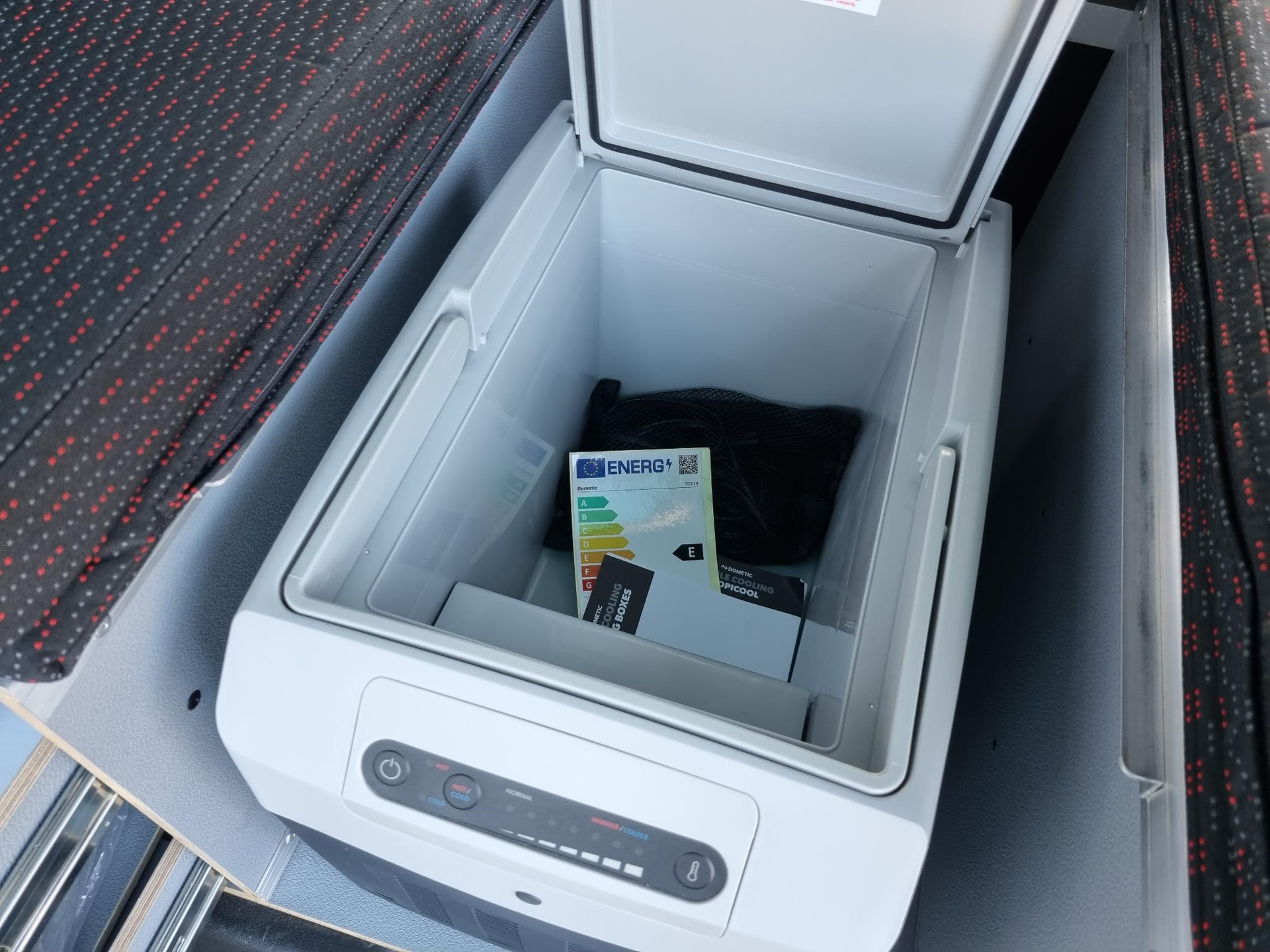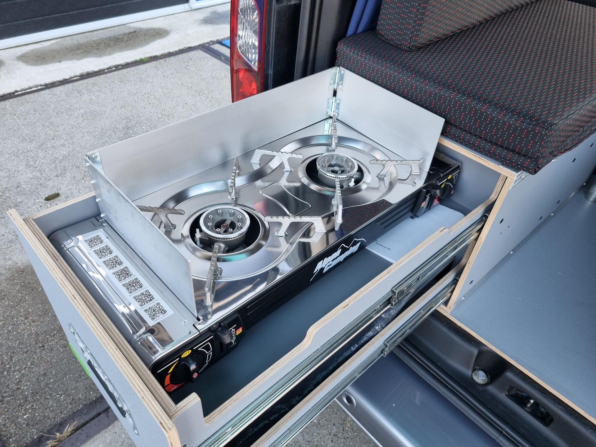 De box biedt naast een 2 persoons bed een zitje met draaibaar tafeltje, 2 pits kooktoestel, koelkast,